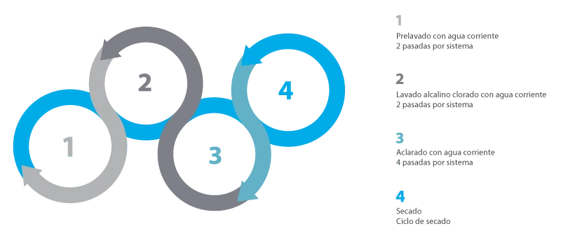 Lavado con aguas perdida (programación por autómata GIBAIR): agua caliente + alcalina clorada.
