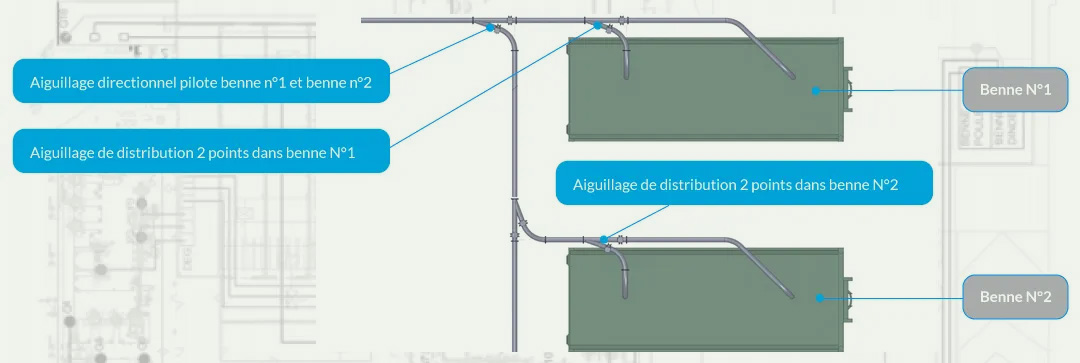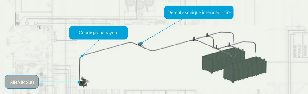 La détente intermédiaire facilite les transferts sur de très longues distances. En installant ces détentes tous les 50 mètres, cela nous permet un transfert efficace et maîtrisé sur 500 mètres et plus. De part notre maitrise empirique du process de transfert par pression positif, nous pouvons facilement gérer leurs disposition selon le produit à transférer.