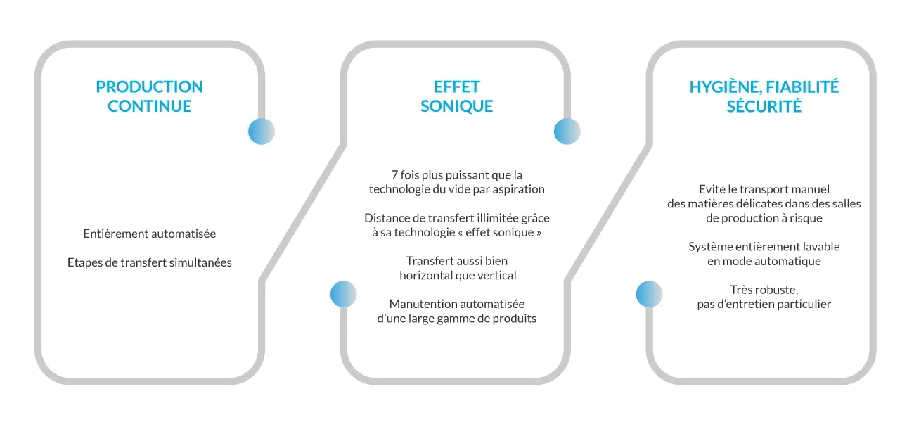 Sur le même principe qu’une sarbacane, l’effet sonique vise à contraindre un volume d’air sous pression pour comprimer la matière et l’expulser à forte vitesse dans la tuyauterie. Il permet de minimiser considérablement la consommation d’air comprimé quelle que soit la distance à parcourir (comparé à l’aspiration ou aux canons à air).